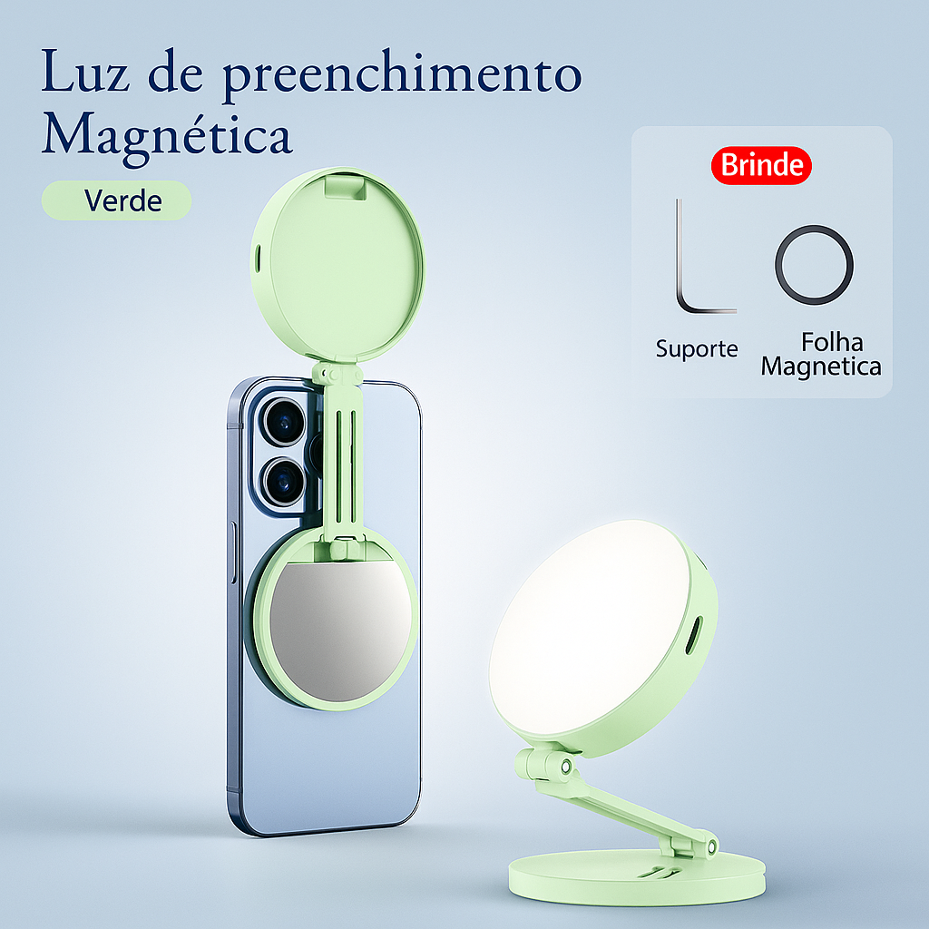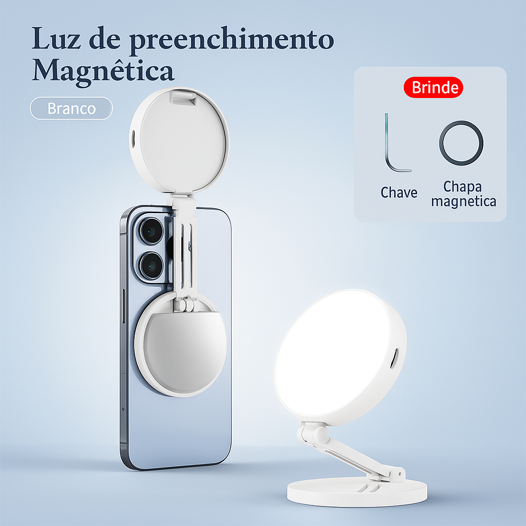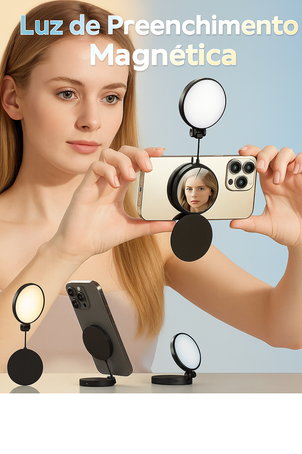 Compacta, leve e recarregável 🔋, ela se conecta magneticamente ao seu celular 📱, oferecendo brilho natural e ajustável em todas as condições de luz.