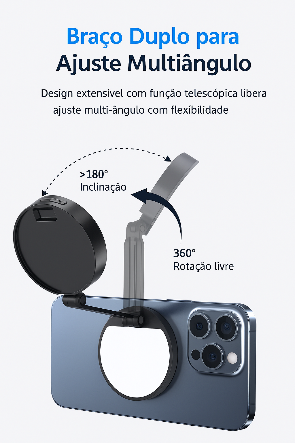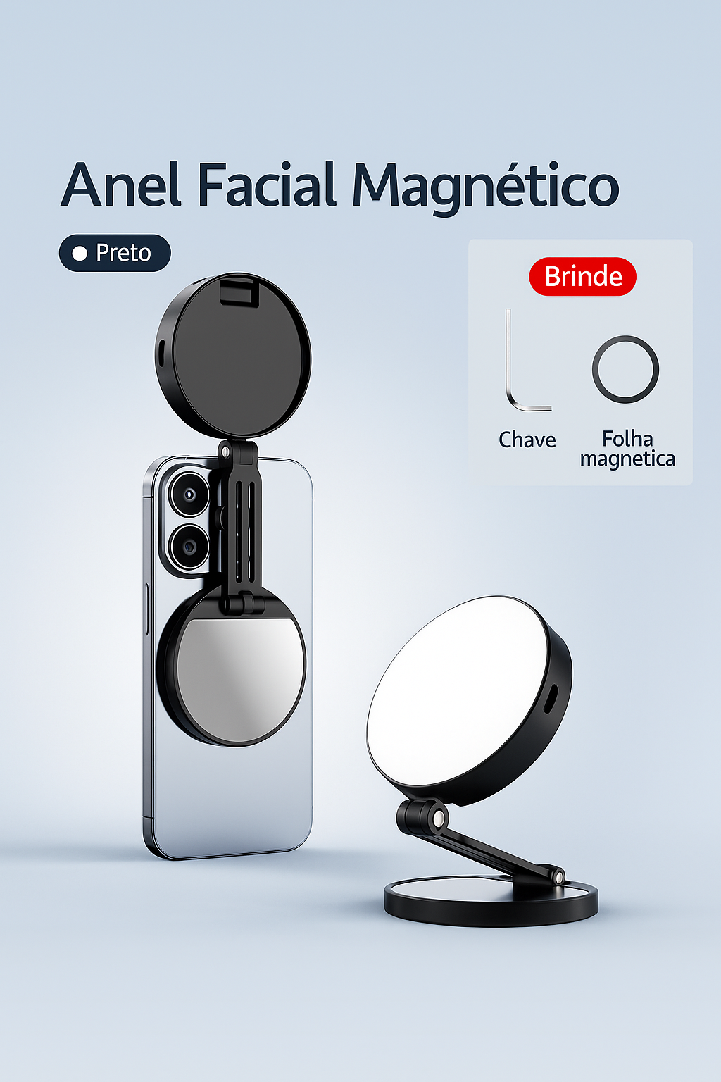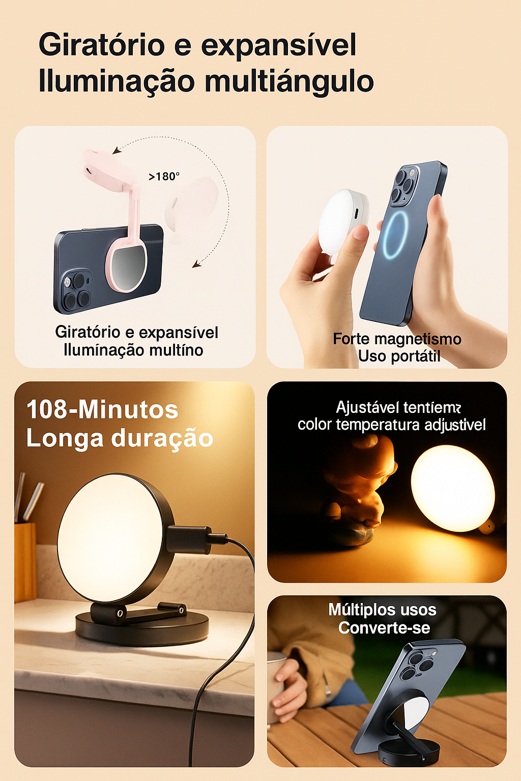 Compacta, leve e recarregável 🔋, ela se conecta magneticamente ao seu celular 📱, oferecendo brilho natural e ajustável em todas as condições de luz.